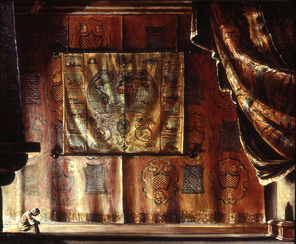 À l'essence de cette ombre, un minuscule personnage : L'HOMME si petit dans tout cela. Il est éclairé par un foyer. En toile de fond : le monde. Et au dessus de l'existence de cette ombre, une énorme et lourde tenture qui recouvre le tout de mystère.