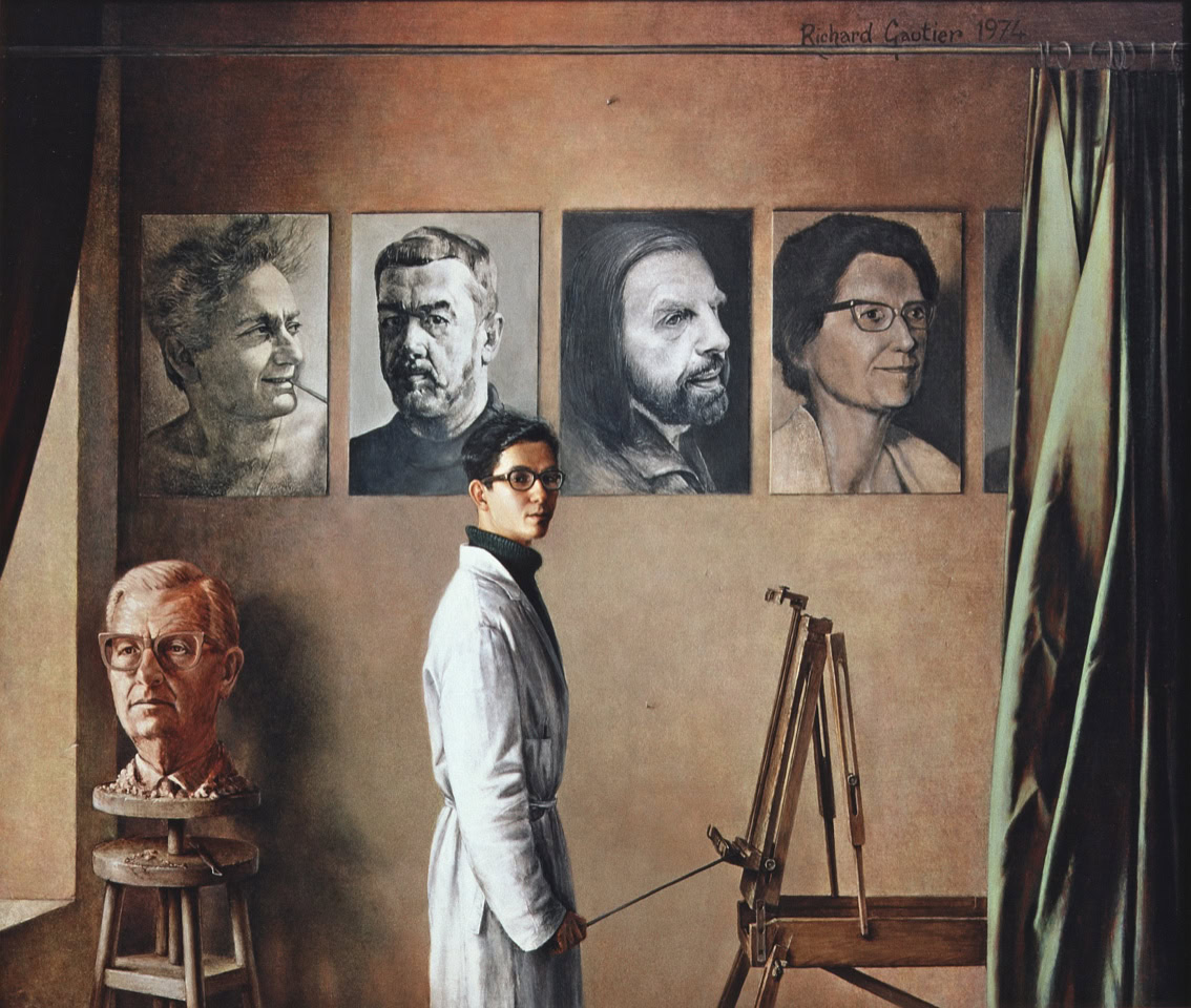 En fond, les posters des aînés de Richard en 1974. De gauche à droite : GUALTIERI (Galatée Gallerie Bd du Montparnasse), THESSONNIER portraitiste (Montrouge), CADIOU (Chef de fil du mouvement Les Peintres de la Réalité, son parrain professionnel, la Citée Fleurie Bd Arago Paris 13°), Mme Camille VERSINI, présidente de l'académie Anquetin (Neuilly). Derrière lui, en modelage, son père le céramiste Jean-Marie GAUTIER (Niort).
