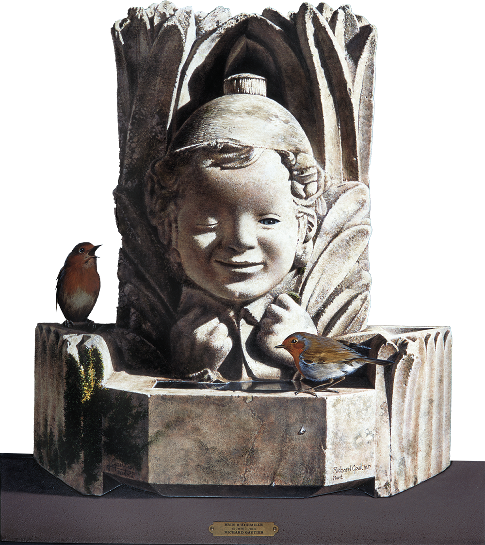 Aiguaille veut dire en patois : rosée - Petit lutin de la légende du marais sculpté en forme de fontaine par son père (sculpteur et céramiste), auquel Richard a ajouté son clin d’œil et deux rouges gorges.
